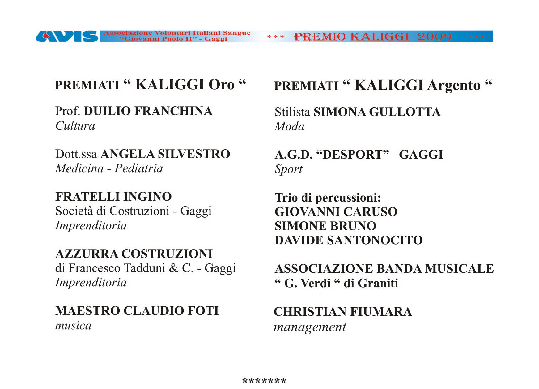 ALBO D'ORO DEI PREMIATI CON IL KALIGGI 2009