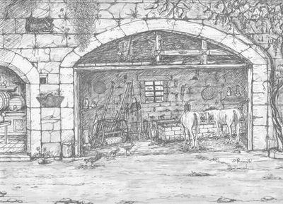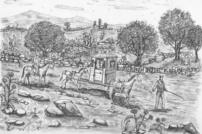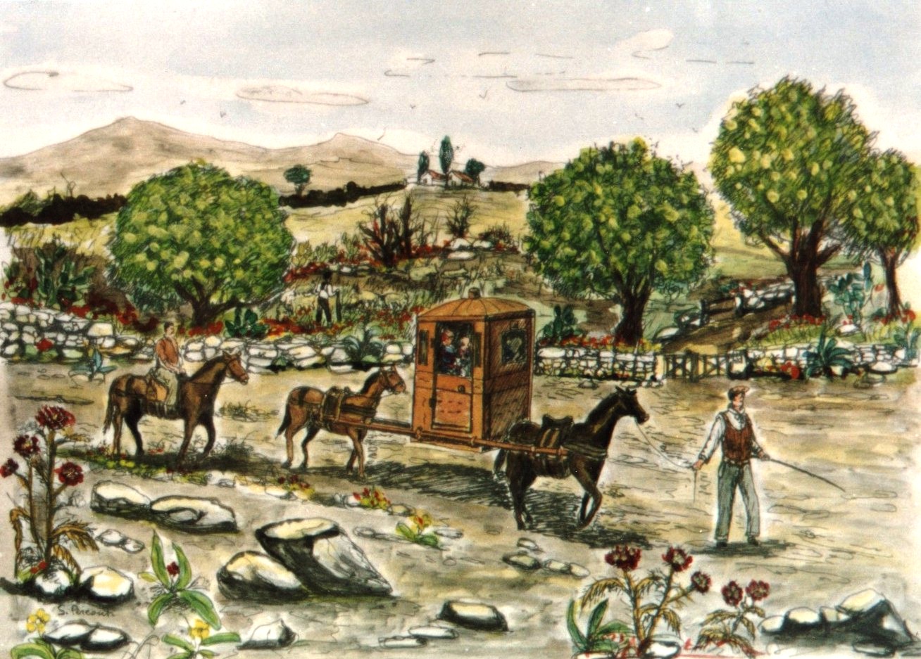 Mulo bardato e lettiga "muloco' varduni e littiga " - scena 1 La prima scena illustra il modo in cui venivano accompagnati illustri visitatori ed ospiti illustri a visitare i loro possedimenti o semplicemente per spostarsi da un punto all'altro delle loro proprietà. C'è da dire che la lettiga era già nota tra gli antichi popoli romani, Egiziani, Babilonesi, ... e questo servizio veniva espletato dagli schiavi, mentre nel tempo a cui si riferisce la scena venivano impiegati dei muli o dei cavalli con due uomini "vardunara". Uno di questi, a piedi, precedeva la lettiga, mentre l'altro la scortava, seguendola a cavallo. Il viaggio non era molto comodo, ma la lettiga era simbolo di potenza ed importanza per coloro che la possedevano e se ne servivano anche per gli ospiti. La stessa scena riportata ad oggi è come avere un TAXI.