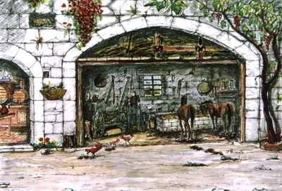 SCENA II Con la II scena, '"u carritteri" (Il carrettiere), si è voluto illustrare il modo in cui veniva trasportato il grano ed altre masserizie. Il carrettiere era molto orgoglioso del suo carretto, tutto finemente pitturato a mano, come potete notare nel disegno, con scene delle battaglie dei Paladini di Francia. Il mulo non era considerato solo un animale da lavoro ma il compagno di tutti i giorni con il quale si divideva la fatica dei lunghi viaggi; infatti veniva trattato con grande rispetto e durante i lunghi tragitti il carrettiere dialogava con lui. Per le grandi occasioni il carretto e il mulo venivano abbelliti con pennacchi e ornamenti variopinti. L'autore, nel suo libro, descrive magnificamente la scena e dedica un intero capitolo riportando canti e mottetti già noti che rispecchiano la nostra cultura. Per me, fin da bambino, il carretto è sempre stato un'attrazione; infatti mio zio "Turiddu", uomo di spirito e ingegnoso per fantasia e creatività, riusciva sempre ad accontentarmi, costruendomi, in diverse occasioni, un carrettino con ruote di legno o addirittura con cuscinetti a sfera, allora molto rari. Non era un vero carretto con i Paladini dipinti, ma si adattava allo scopo: trasportare quelle cianfrusaglie di cui ci servivamo noi ragazzi per giocare o per salirci sopra e farci spingere. |