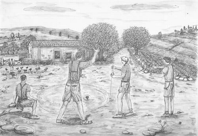 La trottola - " u tuppetturu " scena 16 XVI scena "U tuppetturu" non era altro che una biglia sfilata da un lato con in punta un chiodo. Questa, per mezzo di un laccio tenuto fra due dita e arrotolato dalla punta fino al limite della parte conica, veniva lanciata con forza a terra. Questo movimento gli imprimeva un senso rotatorio su se stessa e la prima che si fermava perdeva la partita. Era divertimento e confronto. Chi perdeva pagava il pegno: 5, 6, 12 o addirittura 20 pizzate, cioe: chi vinceva colpiva con la punta del proprio "tuppetturu" la superficie superiore di quella dell'avversario che, spesso, per troppi colpi ricevuti si rompeva, provocando amarezza e delusione |