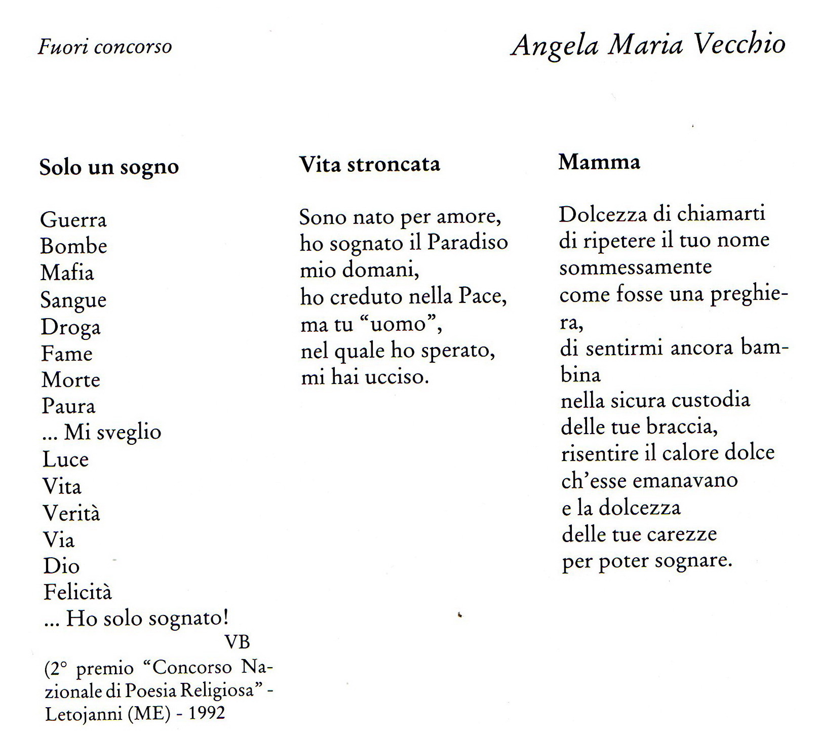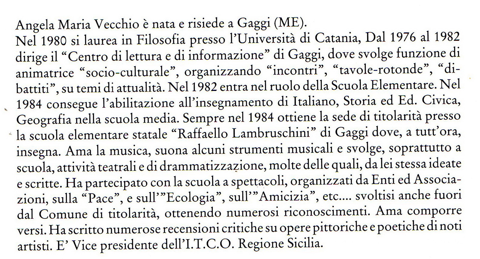 Prof.ssa ANGELA MARIA VECCHIO - poeta Vice pres. I.T.C.O Reg. Sicilia resp. attivitą educative e presentatrice concorsi "Perla dell'Alkantara" e "Premio "Kaliggi" Pres. Ass. Colontari Italiani "Giovanni Paolo II" Gaggi. Me