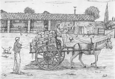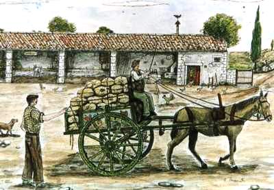 SCENA II Con la II scena, '"u carritteri" (Il carrettiere), si è voluto illustrare il modo in cui veniva trasportato il grano ed altre masserizie. Il carrettiere era molto orgoglioso del suo carretto, tutto finemente pitturato a mano, come potete notare nel disegno, con scene delle battaglie dei Paladini di Francia. Il mulo non era considerato solo un animale da lavoro ma il compagno di tutti i giorni con il quale si divideva la fatica dei lunghi viaggi; infatti veniva trattato con grande rispetto e durante i lunghi tragitti il carrettiere dialogava con lui. Per le grandi occasioni il carretto e il mulo venivano abbelliti con pennacchi e ornamenti variopinti. L'autore, nel suo libro, descrive magnificamente la scena e dedica un intero capitolo riportando canti e mottetti già noti che rispecchiano la nostra cultura. Per me, fin da bambino, il carretto è sempre stato un'attrazione; infatti mio zio "Turiddu", uomo di spirito e ingegnoso per fantasia e creatività, riusciva sempre ad accontentarmi, costruendomi, in diverse occasioni, un carrettino con ruote di legno o addirittura con cuscinetti a sfera, allora molto rari. Non era un vero carretto con i Paladini dipinti, ma si adattava allo scopo: trasportare quelle cianfrusaglie di cui ci servivamo noi ragazzi per giocare o per salirci sopra e farci spingere. |