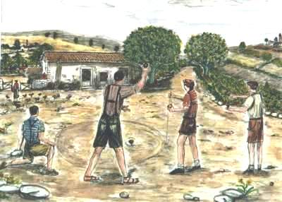 La trottola - " u tuppetturu " scena 16 XVI scena "U tuppetturu" non era altro che una biglia sfilata da un lato con in punta un chiodo. Questa, per mezzo di un laccio tenuto fra due dita e arrotolato dalla punta fino al limite della parte conica, veniva lanciata con forza a terra. Questo movimento gli imprimeva un senso rotatorio su se stessa e la prima che si fermava perdeva la partita. Era divertimento e confronto. Chi perdeva pagava il pegno: 5, 6, 12 o addirittura 20 pizzate, cioe: chi vinceva colpiva con la punta del proprio "tuppetturu" la superficie superiore di quella dell'avversario che, spesso, per troppi colpi ricevuti si rompeva, provocando amarezza e delusione |