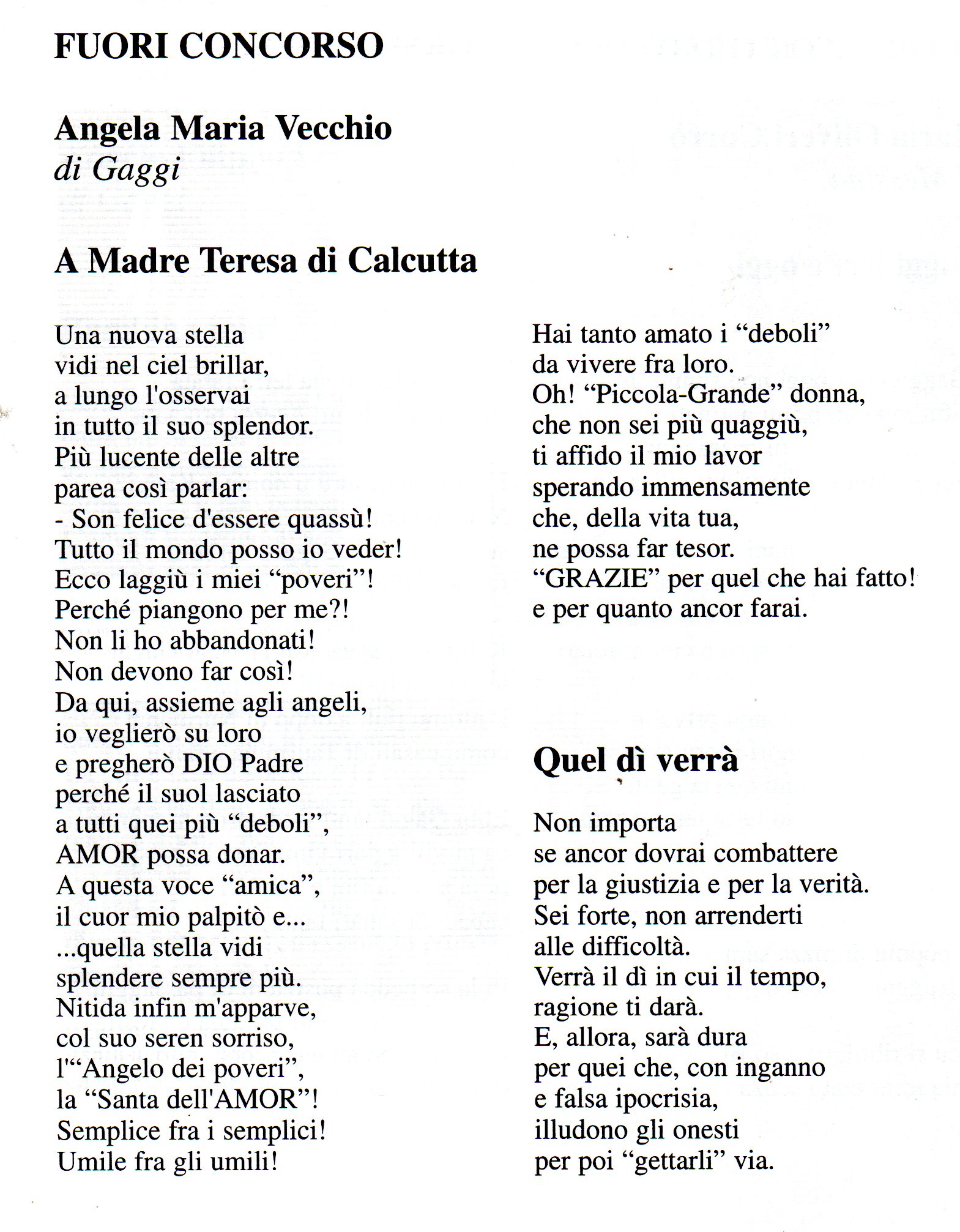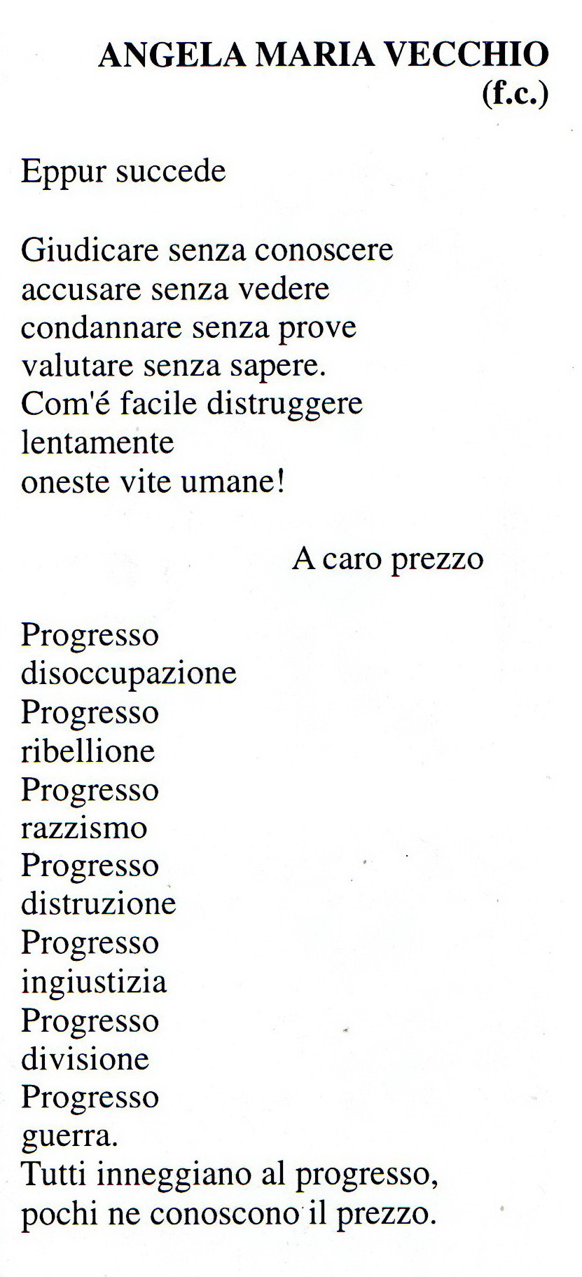 Prof.ssa ANGELA MARIA VECCHIO - poeta Vice pres. I.T.C.O Reg. Sicilia resp. attivitą educative e presentatrice concorsi "Perla dell'Alkantara" e "Premio "Kaliggi" Pres. Ass. Colontari Italiani "Giovanni Paolo II" Gaggi. Me